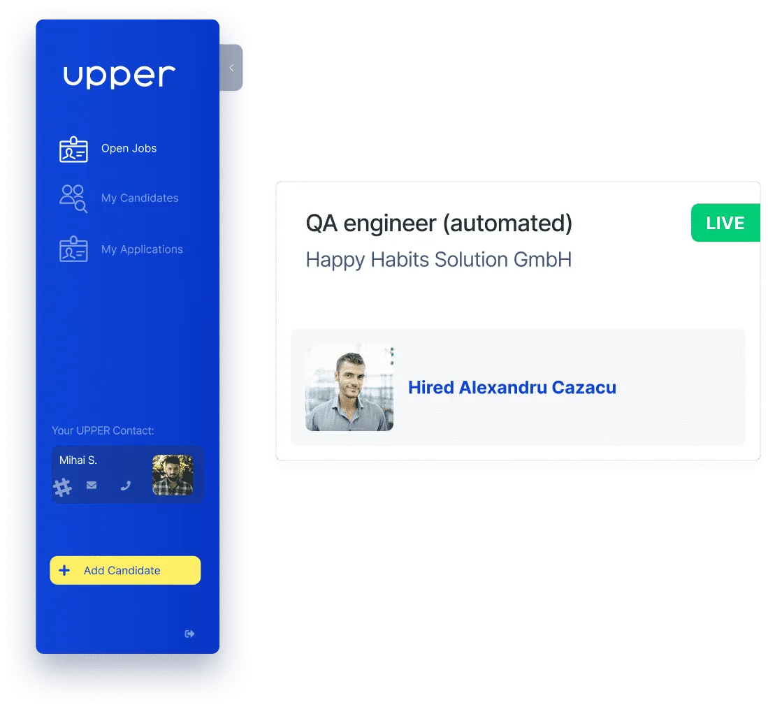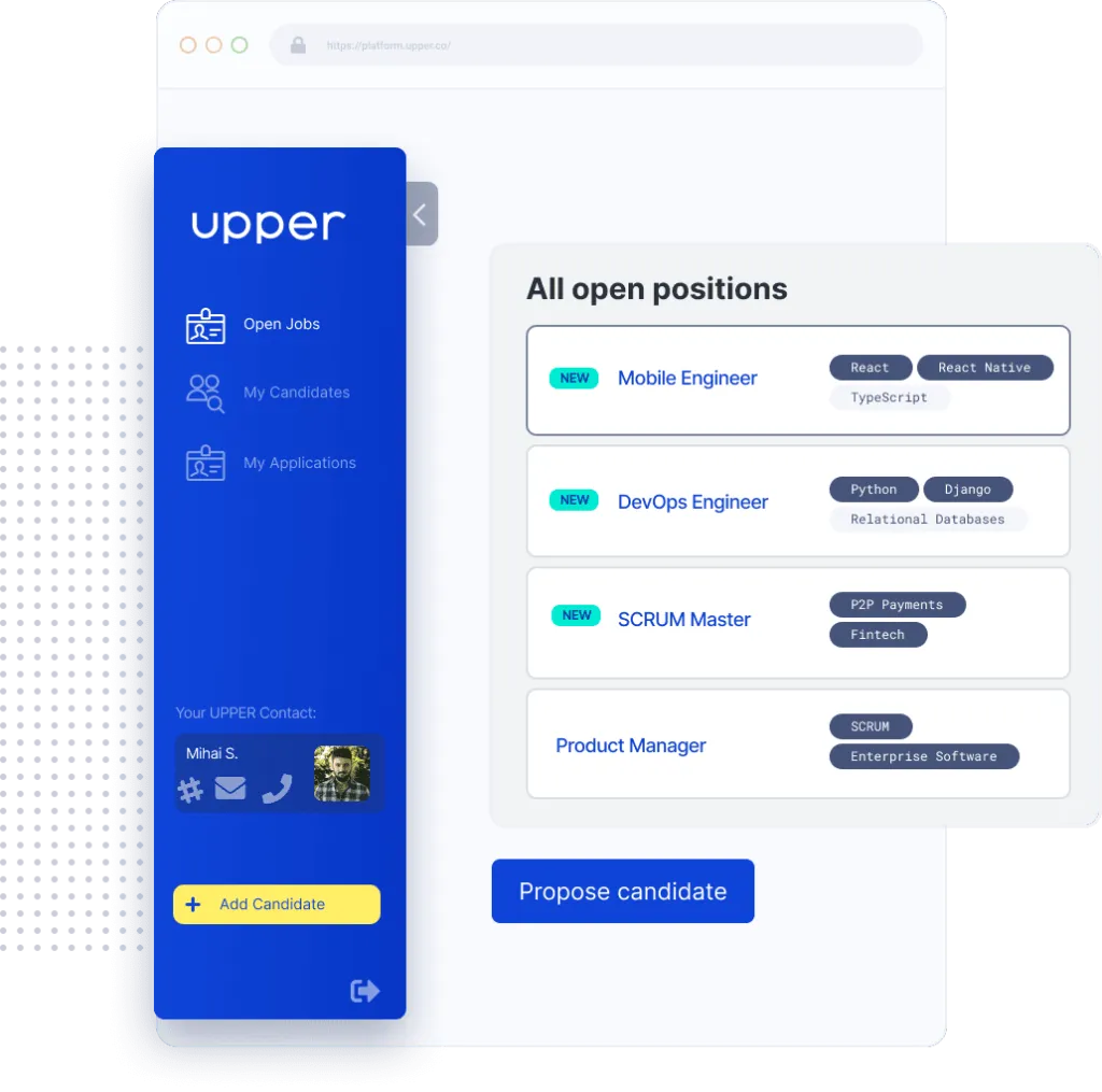UPPER is a platform that connects top tech freelancers from Europe with companies in need of talent. Our goal is to match the right tech people with the right roles and projects, and we support dozens of companies across various industries to scale their teams and build their products.